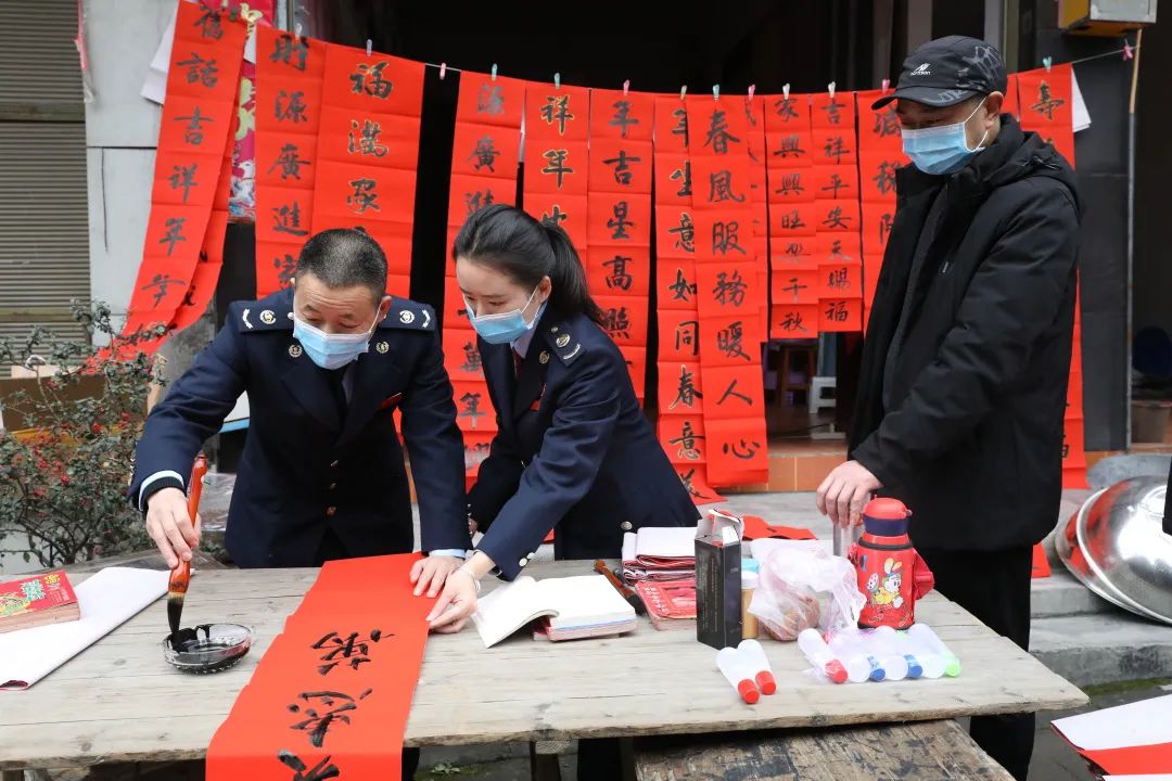 在重庆,国家税务总局秀山县税务局外省留渝过年税务干部自发成立税宣志愿队,前往社区开展“新春祝福送到家 税惠政策大家拿”宣传活动。图为税务干部到社区写新春祝福对联。(何川/摄)