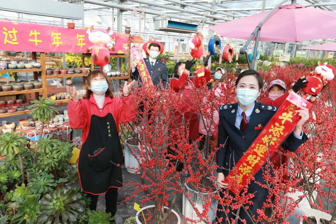 在山东,国家税务总局桓台县税务局干部到润邦生态农业专业合作社了解企业年花备货、销售情况,提供涉税辅导服务,并为企业人员送上新年祝福。(孙智超/摄)