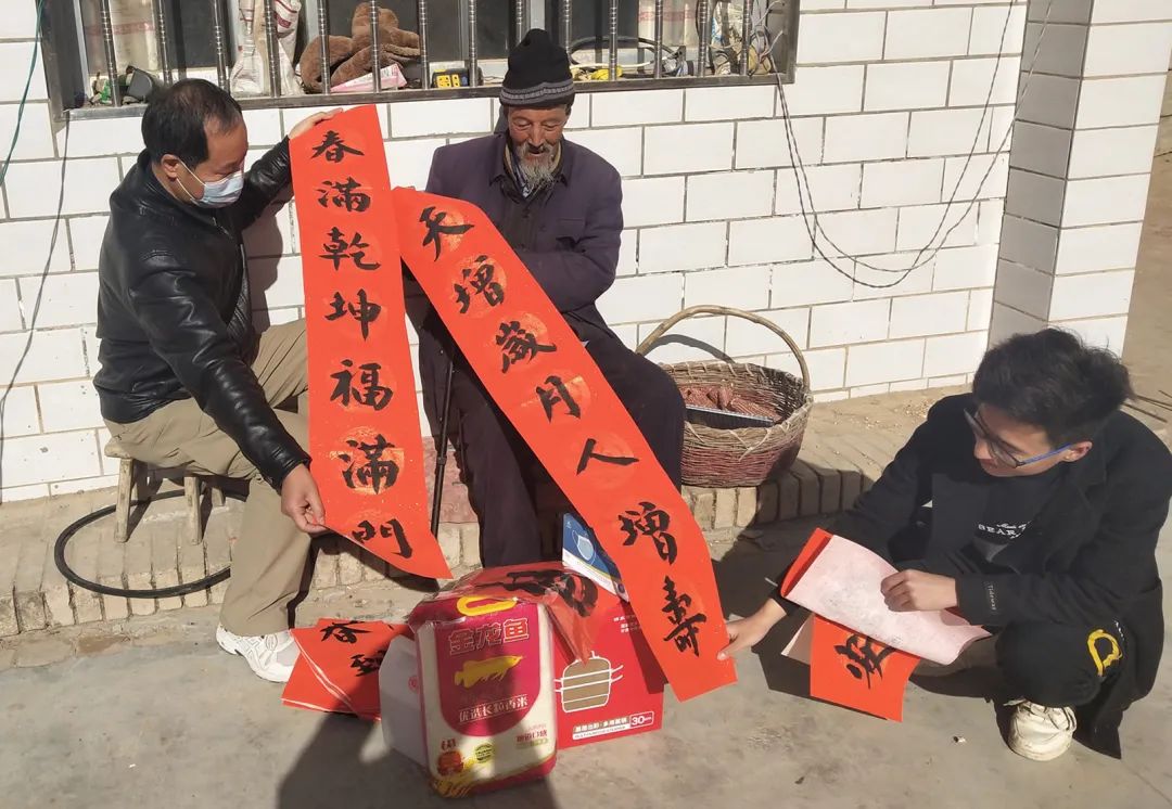 在甘肃,国家税务总局甘肃省税务局干部为村民们送去新春祝福。图为驻镇税务干部为村民送去不锈钢蒸锅、大米、清油、春联等慰问品。(金琳/摄)