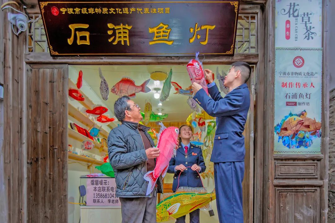 在宁波,国家税务总局象山县税务局青年干部与宁波市非物质文化遗产鱼灯制作技艺传承人一起制作、悬挂各色鱼灯,助力老店焕新颜。(裘敬/摄)