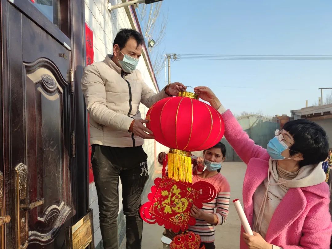 在新疆,国家税务总局新疆维吾尔自治区税务局干部同村民们一起贴春联、挂灯笼,为村子添满喜庆“年味”。(费翔/摄)
