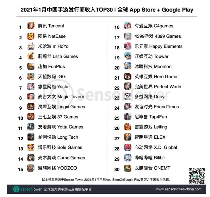 收入榜前两名被大厂牢牢占据,第三名的位置则是余下厂商角逐的对象。2020年,莉莉丝游戏凭借着《剑与远征》攀升至收入榜第三,与铺天盖地的投放分不开。时隔一年,Sensor Tower于一月初发布的《中国手游发行商收入Top30》榜单中,莉莉丝游戏已被米哈游超越,排在第四位。