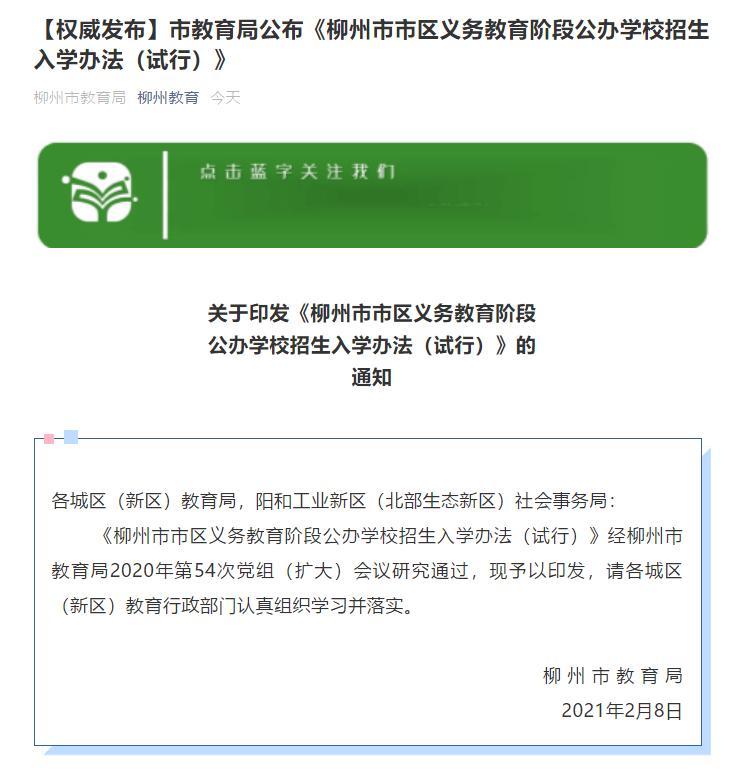2月9日,市教育局印发《柳州市市区义务教育阶段公办学校招生入学办法(试行)》的通知,与往年不同的是,今年的《办法》明确了学位锁定政策,即对小学、初中适龄学生入学使用的不动产(房产)实行锁定,政策实施时间不早于2022年,实施范围由各城区(新区)根据辖区学校生源状况确定。
