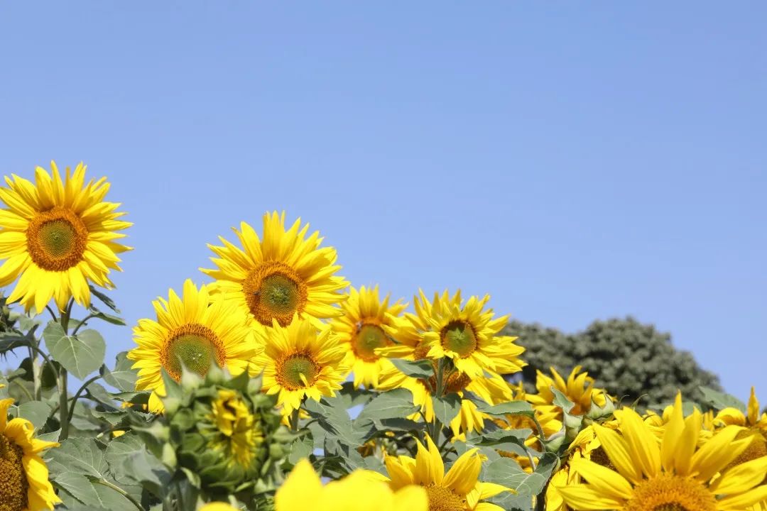 明媚的阳光下,金黄色的波浪层层叠叠,成片的向日葵美得像一幅油画。蓝天白云下,向日葵朝着太阳的方向探头,充满朝气,每一株都像在跟你打招呼。