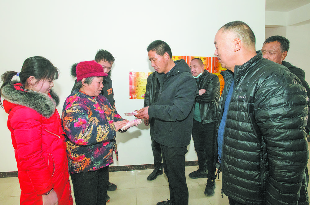 村委会一班人来到村民马云(左二)家,把34780元全村群众的捐款,转交给她,让她过一个放心年。马云丈夫病故,儿子因车祸身亡,独自带着孙子孙女生活。