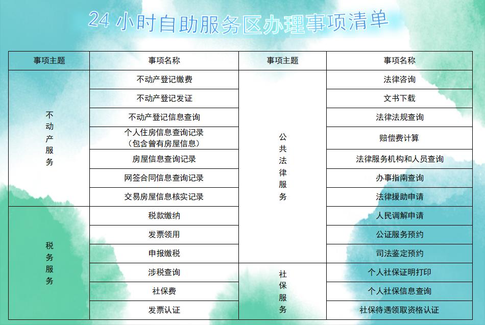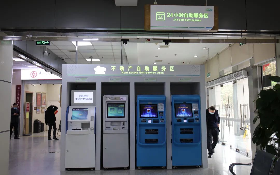 24小时自助服务区设置于政务中心入口处右侧,设置自助服务终端14台,涵盖不动产登记信息、城乡居民个人社保信息查询、公共法律服务、审批服务申请等25项高频事项政务服务内容。