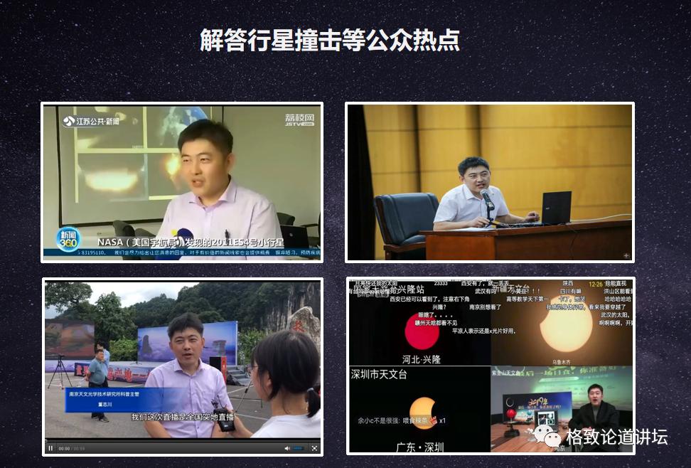 大力弘扬科学精神,普及科学知识,倡导科学理念,传播科学方法,这是我在通过媒体回答公众对于小行星撞击以及最美“金边日食”,还有银仙座流星雨的一些画面。