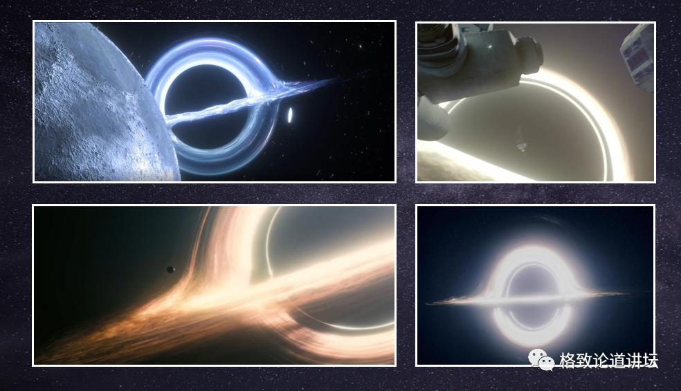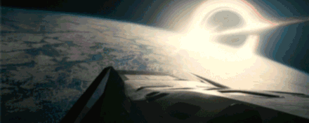 这是艺术家和科幻作家笔下的黑洞的形象,出现在星际穿越的剧本中,在星际穿越中,我们也看到了另外一个相对论现象,因为黑洞巨大的引力,它让时间变慢。