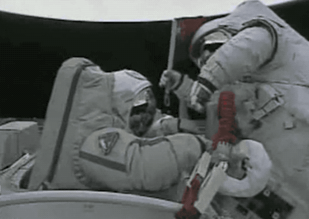 这是他第一次太空行走的时候,这个飞船是多么的狭小和逼仄,等他返回的时候,发现已经进不了舱门了,他只能冒险把自己的宇航服里的氧气放掉一半,才得以回到舱门里面。