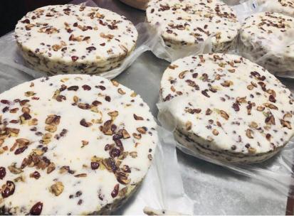 这种蒸糕也不是一次完成的,而是先在桶底撒一层经密眼筛子过滤的糕粉,固化后再下核桃和枣肉,再撒一层粉后继续蒸,如此者三,才能完成一块有形有款有味的崇明糕。