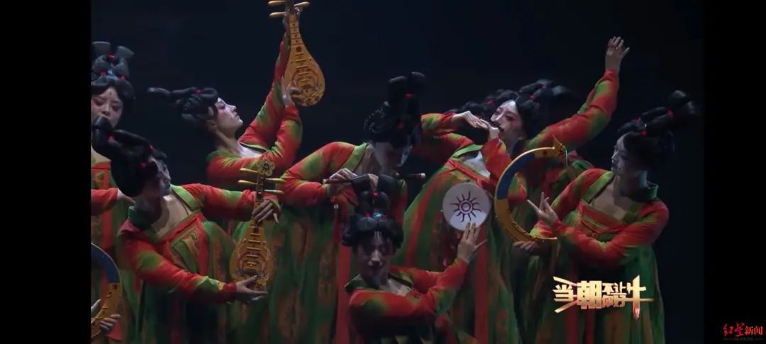 唐宫夜宴值得一提的是,为了体现丰腴的唐代少女形象,演员们身上穿着塞海绵的连体衣,嘴里含着棉花,而眼角两道月牙形的妆容,也完全再现了风靡于唐代的女性面部潮流妆容“斜红”。