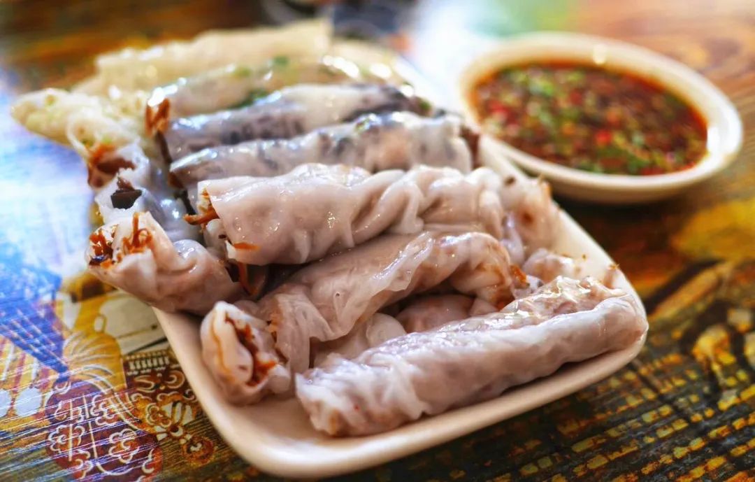 网络图片。卷粉以皮薄著称,嫩、薄、滑、润,馅料为香葱木耳肉末馅,将炒熟的馅料包裹在蒸制好的粉皮中,再搭配一碗梅姨秘制的酸汁,这味道~正是正宗的华侨味道。三十几年来,卷粉一直深受广大顾客的喜爱,多年来一直被模仿,但从未被超越!