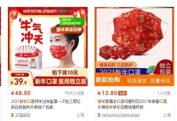 “口罩已经成了生活必需品,现在过节出门戴上红口罩也显得喜庆。”读者李女士说,她特意在节前囤了两包红色的口罩。在电商平台上,输入“新年口罩”,显示的商品目录条数近两千条,有的商品说明上还标注了“医用外科”等字样。记者从电商平台上购买了一款新年口罩,从外观上看,红彤彤的口罩上印着小牛以及一些吉祥话,摸起来很厚实。商家表示这是一次性口罩,并不是医用口罩,佩戴的话也可以防细菌、灰尘、唾液、花粉等。