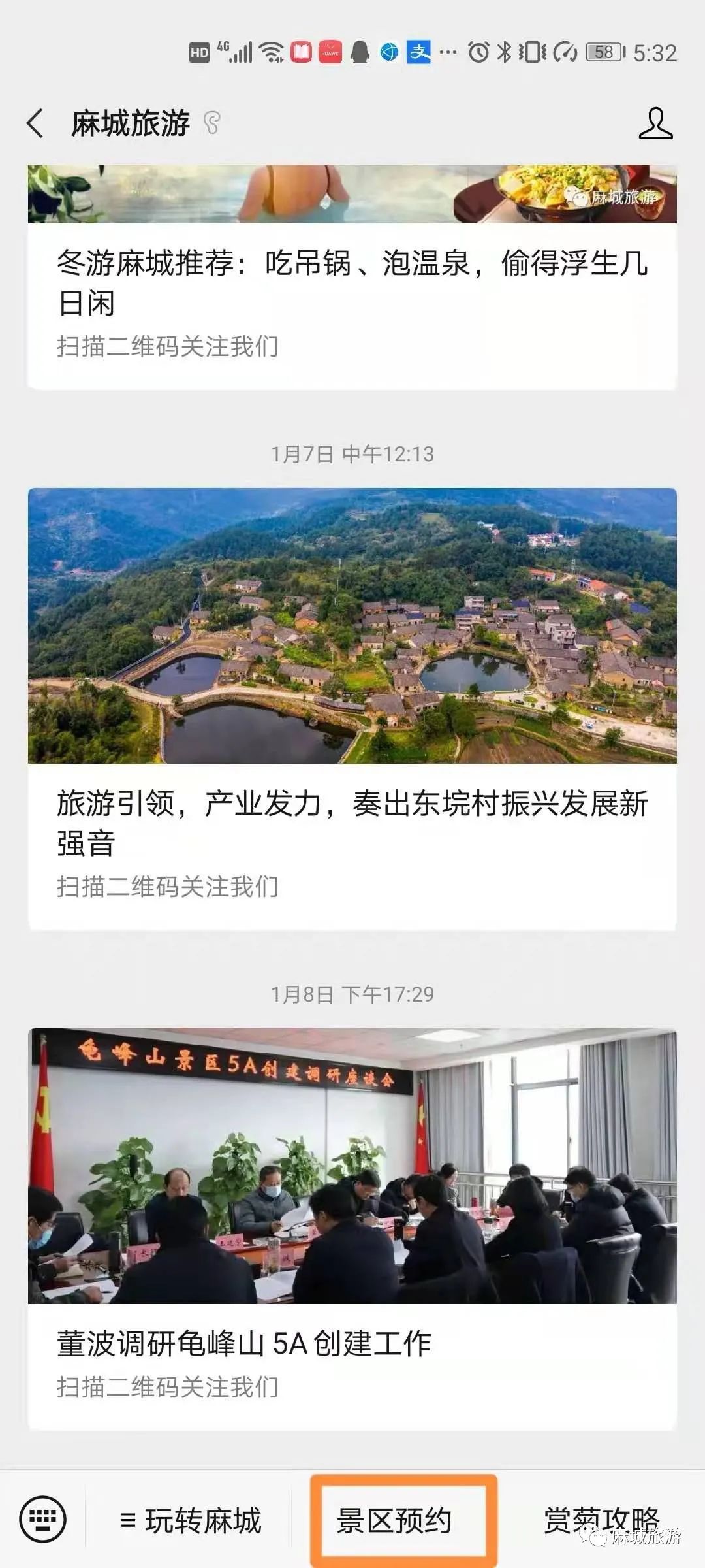 关注“麻城旅游”微信公众号,进入公众号后,点击底部“景区预约”菜单,即可跳转至预约页面。