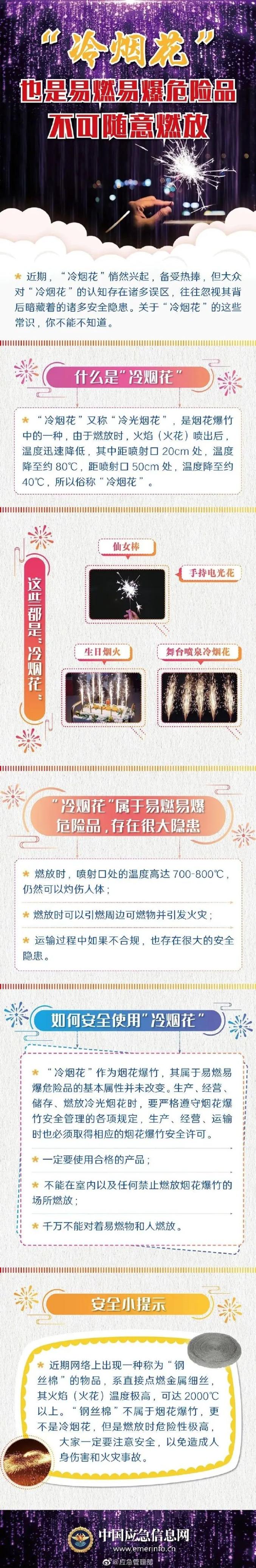 其中提到:针对部分城市烟花爆竹供需两旺,应急管理部要求各地应急管理部门加强风险预警研判,强化安全管控措施,加大巡查检查力度,并做好安全宣传警示。春节假期以来,各级应急管理部门共检查烟花爆竹批发企业、零售店(点)10万家次,发现并督促整改隐患问题8000余项。特别是针对冷光烟花兴起的情况,国务院安委办、应急管理部强调,冷光烟花虽然火焰温度较低、烟雾较少,但喷射口温度仍高达700-800℃,可灼伤人体、引燃物品,作为烟花爆竹,其易燃易爆危险品的基本属性并未改变。生产、经营、储存、运输冷光烟花时,仍要严格遵守有关烟花爆竹安全管理的各项规定,必须取得相应安全许可,严禁以任何形式变相生产、销售。