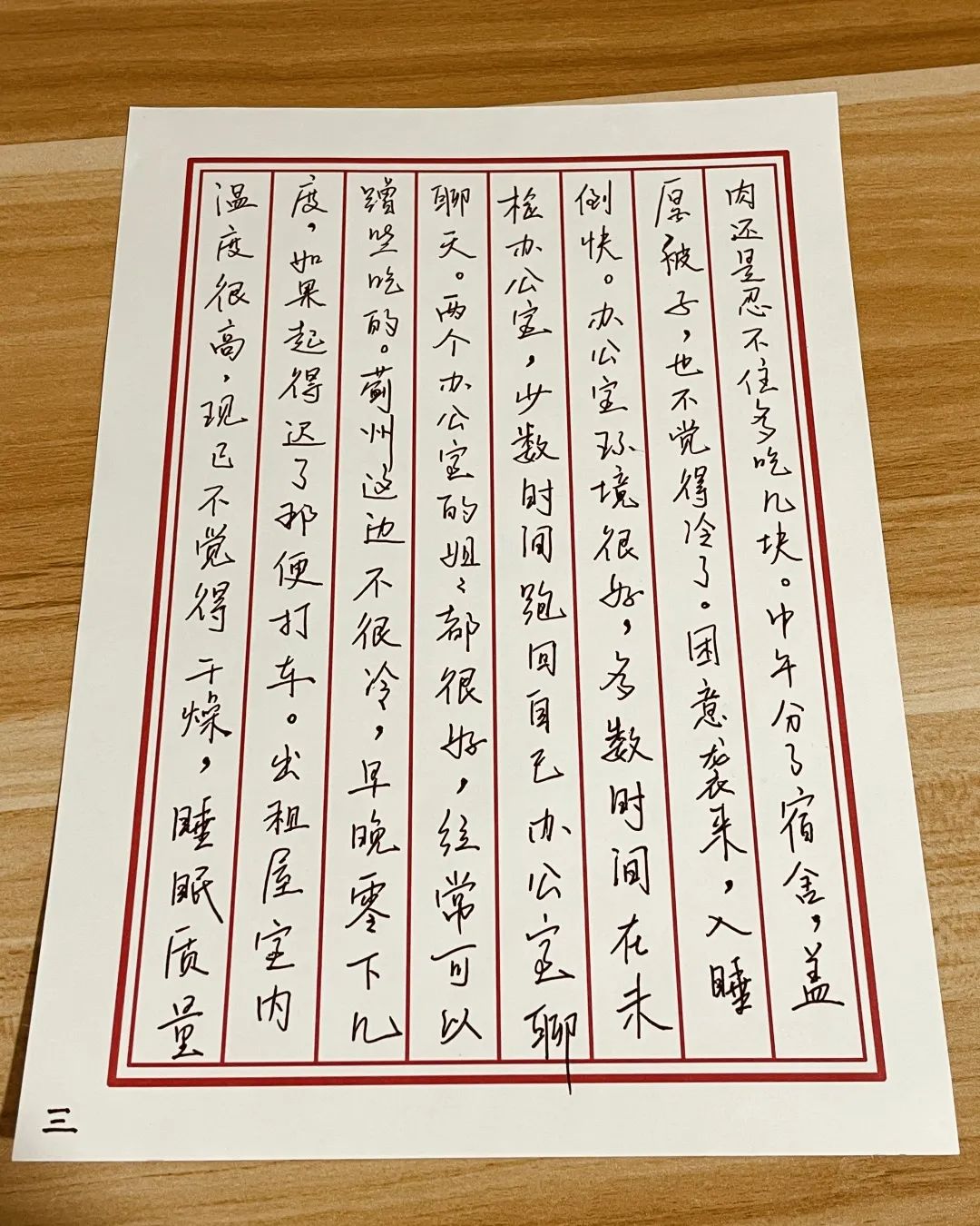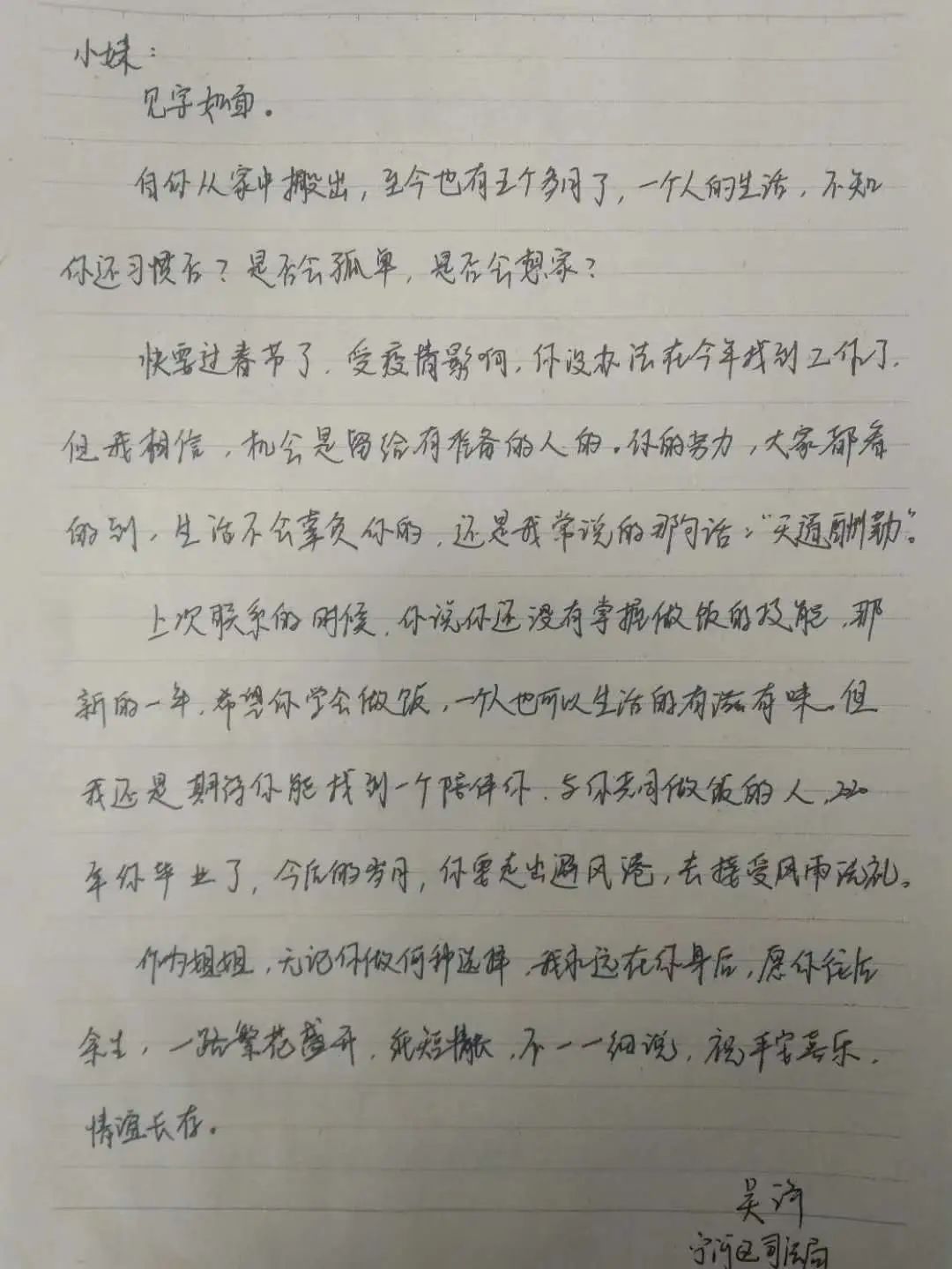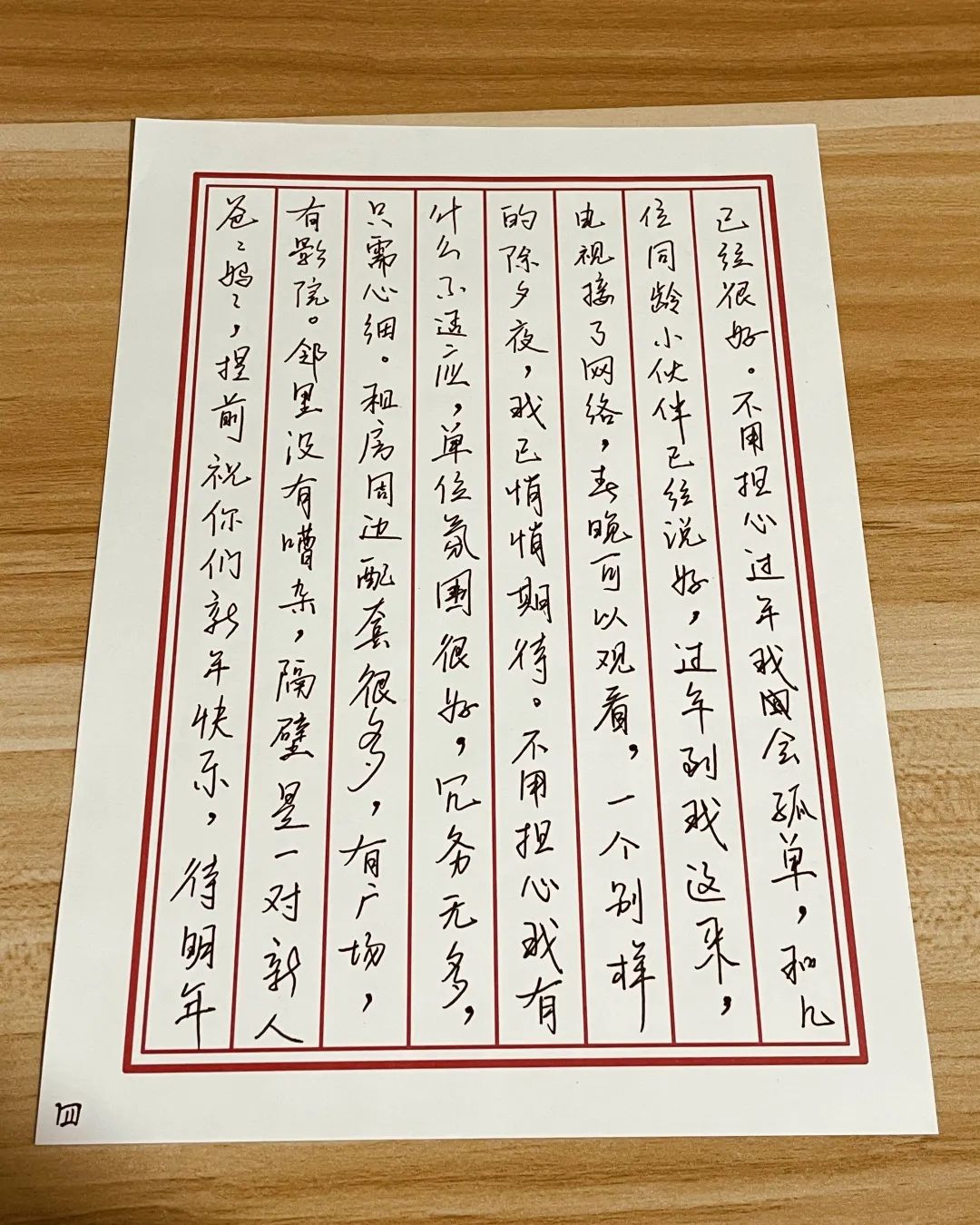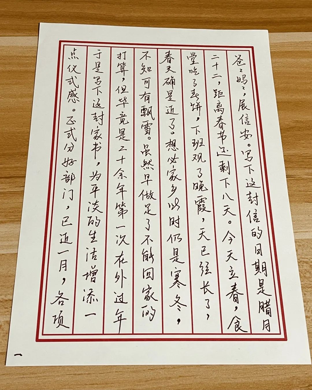 爸妈,忘了告诉您们了,我发工资啦!这是我人生第一次领工资,上星期天,我拿着工资到商场给爸爸买了套护膝,挺软乎的,或许对他在部队执行任务时落下的老寒腿有缓解作用。我还给妈妈买了一条红色的羊绒围巾,妈妈一定喜欢。可惜这些准备春节带回去的东西也和我一样,不能成行了。那就等到春暖花开,山河无恙的季节,我再回我日思夜想的家中与亲人团聚吧。