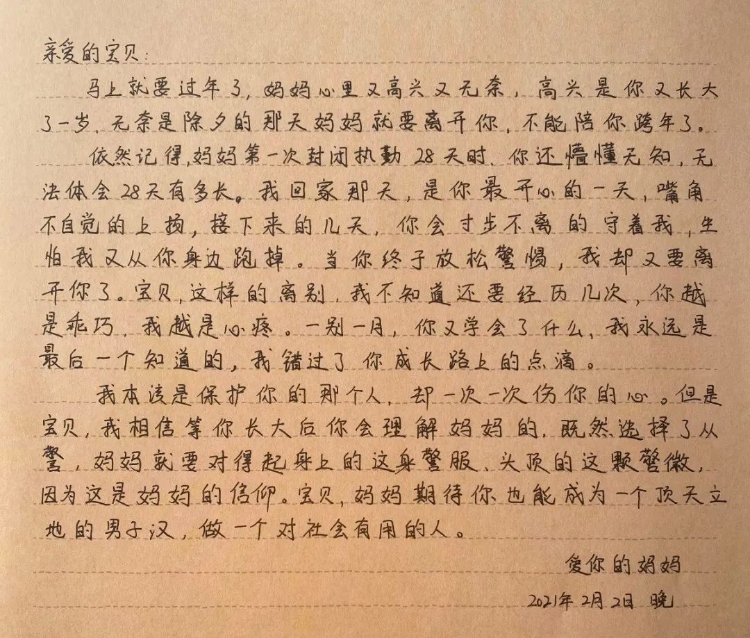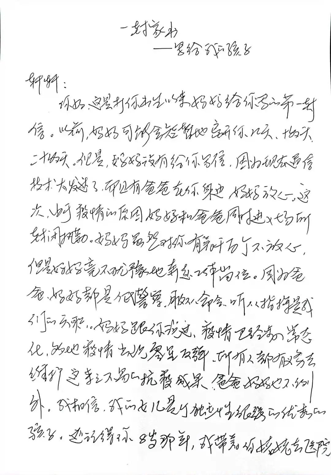 这是你出生以来妈妈给你写的第一封信。由于疫情,爸爸妈妈同时进入场所进行封闭执勤。妈妈虽然对你有千万个不放心,但依然毫不犹豫奔向工作岗位。因为爸爸妈妈都是人民警察,服从命令,听从指挥是我们的天职。我相信,我的女儿是个独立性很强的优秀的孩子。