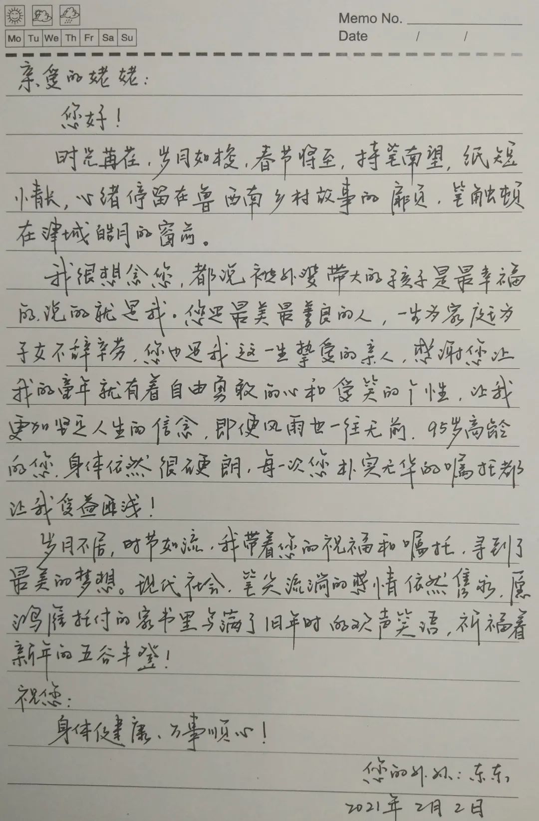 95岁高龄的您,身体仍然很硬朗,每一次您朴实无华的嘱托都让我收益匪浅。我带着您的祝福和嘱托,寻到了最美的梦想。