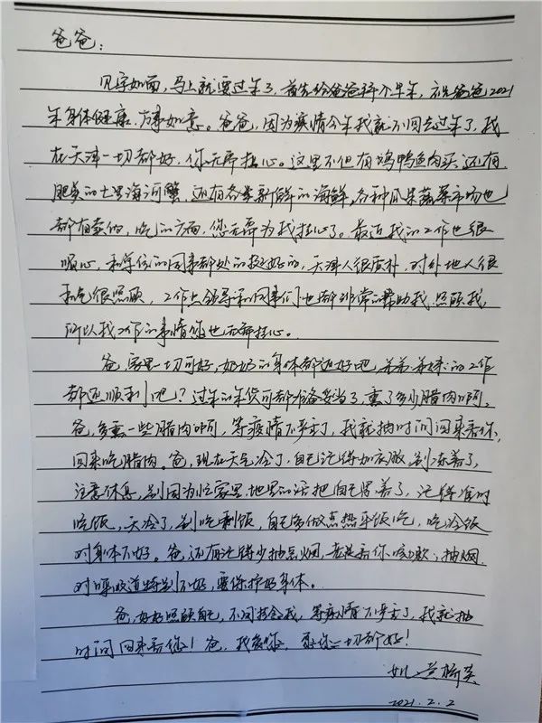 马上就要过年了,首先给爸爸拜个早年,祝爸爸2021年身体健康,万事如意。爸爸今年我就不回家过年了,我在天津一切都好,您无需为我担心了。
