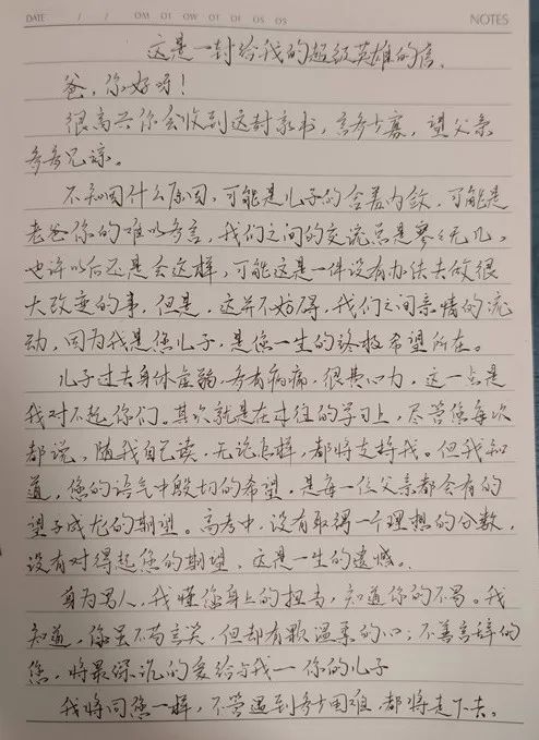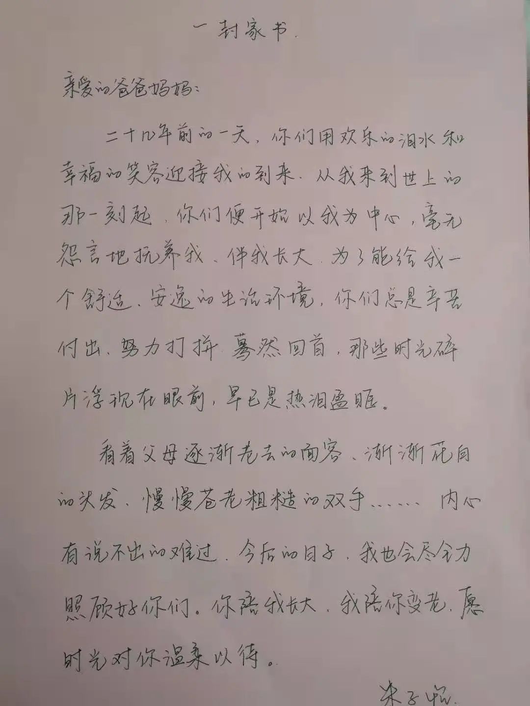儿子过去身体虚弱,多有病痛,很费心力,这一点是我对不起你们。其次就是在学习上,尽管你每次都说,无论怎样都支持我。但我知道,您这句话背后,是每一位父亲都会有的望子成龙的希望。高考中,我没有取得一个理想的分数,没有对得起您的期望,这是一生的遗憾。