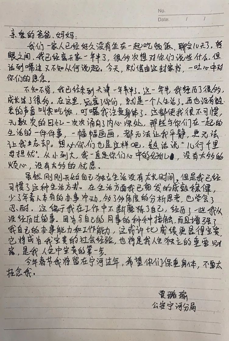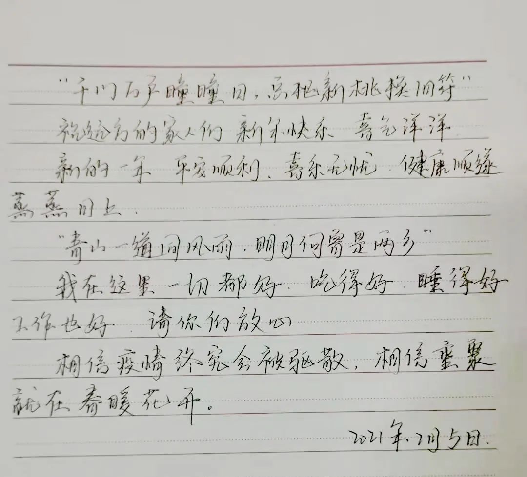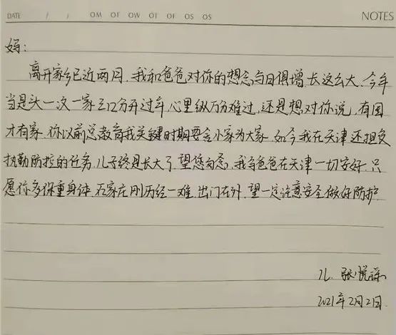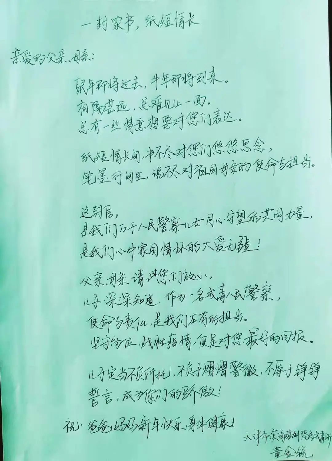 如今我在天津还担负执勤防控的任务,儿子终是长大了,望您勿念。我与爸爸在天津一切安好。只愿你多保重身体,石家庄刚经历一难,出门在外,望一定注意安全做好防护。