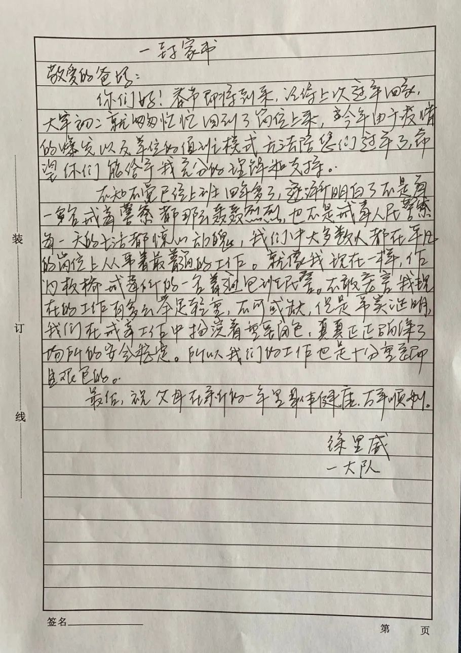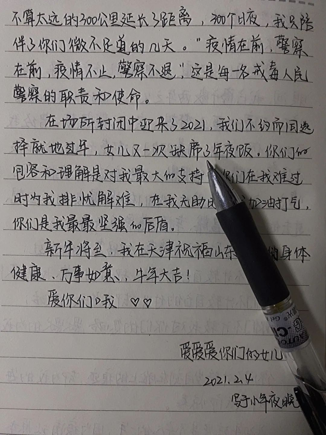 今年您的女儿不能回家过年了,我作为一名新入职的人民警察也要向前辈学习,严防疫情,严守岗位。