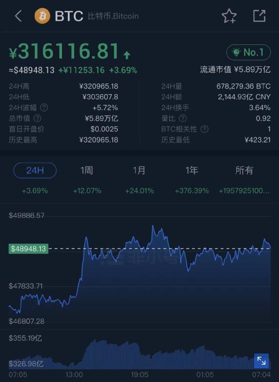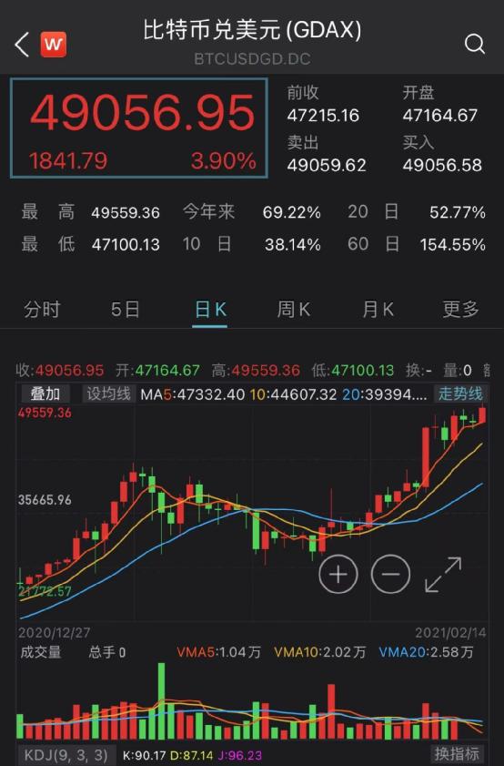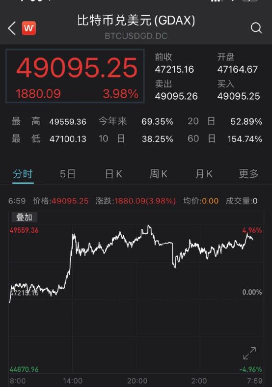 据Wind数据,周日,比特币再次突破新高,触及49559美元的高点,涨幅一度接近5%。