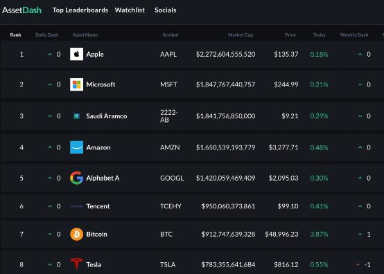 据AssetDash数据,比特币市值在全球资产中排名第七,与第六名腾讯的差距缩小到373亿美元。这意味着,比特币再涨4%,市值便可能超越腾讯。