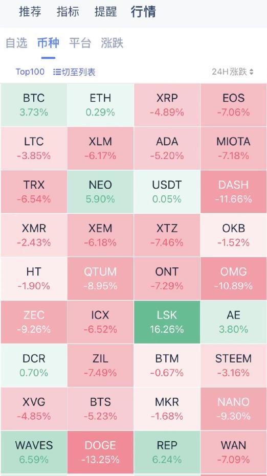 但也有部分加密货币下跌,加密货币市场整体涨跌不一。(红色代表下跌)