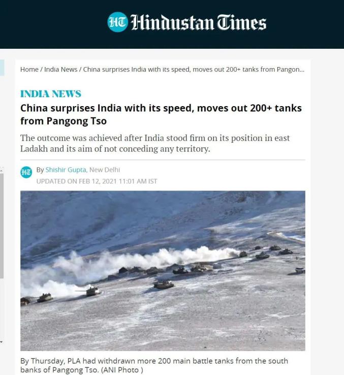 《印度斯坦时报》报道称,中印两国军队在所谓的“东拉达克地区”对峙九个月后,印度陆军的装甲部队和中国人民解放军的一线部队于本周三(2月10日)早上开始从冻结的班公湖南北两岸后撤,为恢复这一地区的和平与安宁铺平了道路。报道还称,截至周四,解放军已经从班公湖南岸撤出了200多辆主战坦克,并调集来了不少于100辆重型车辆,将一线部队从班公湖北岸的一个地区运送到另一个地区。中国如此快速的撤离、部署速度让印度军方高层和国家安全官员感到惊讶。