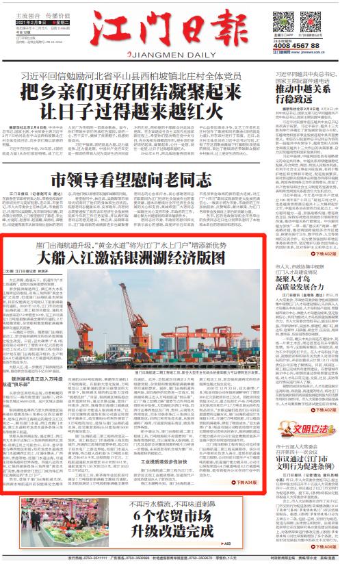 《江门日报》报道一石激起千层浪。随着崖门出海航道动工,新会银洲湖两岸的经济版图随之发生改变。日前,亚太森博(广东)纸业有限公司举行了增资200亿元首批项目动工仪式;江门南洋船舶工程有限公司计划在崖门出海航道升级后,生产制造6.4万载重吨和8.2万载重吨的船舶,提高市场竞争力。
