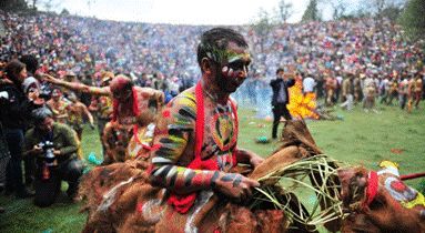 阿细人是彝族的一个支系,自称“阿细”,聚居于云南省弥勒、丘北等地。阿细人崇尚火,把火尊为神。相传很久以前,古老的阿细部落没有火,时常遭到野兽袭击。一位叫木邓赛鲁的先民,在农历二月初三钻木取火得到火种。为纪念取火英雄,阿细人便在这天举行隆重的祭火节。