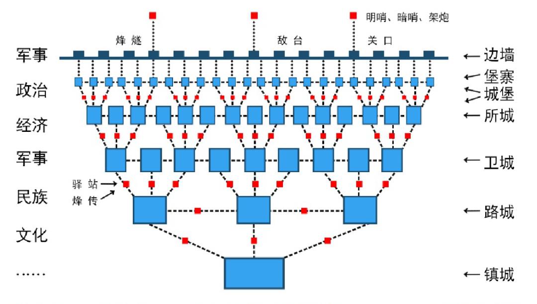 有了先进信息技术及其科研平台的支撑,使长城巨系统的格局更加清晰地展现在众人眼前,墙体、烽燧、敌楼、驿站、聚落……张玉坤一一将其勾勒清楚——“众星拱卫”的放射结构,“横向分段、纵向分层”的线性结构,“秩序叠加”的网络结构。