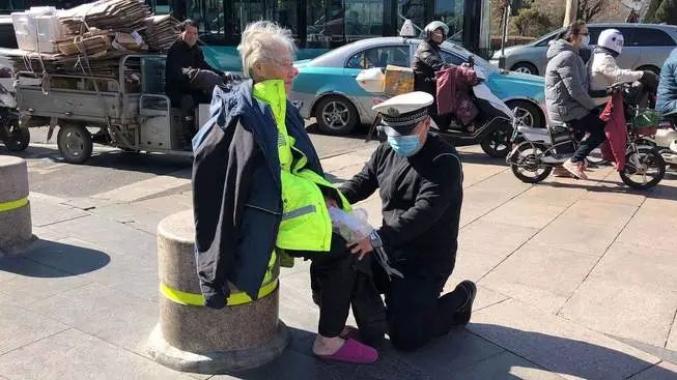 在山东济南,2月17日,大年初六,室外气温降到了零下4度,一位80多岁的老太太,只穿了一件单薄上衣,一条秋裤,光着脚穿着一双拖鞋,在寒风中冻得站都站不稳。历下交警大队辅警吕玮看到后,立刻上前脱下脱掉了身上警服给老人披了上去,又脱下里面的小棉袄给老人盖上腿,并一直单腿跪在老人身边,用身子捂着老人的脚,不断地安慰老人,一直等到派出所民警赶到将其带回找到家人。