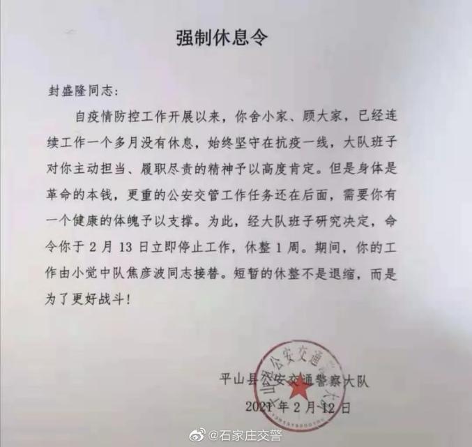 每年春运、春节,几乎都是交警最忙最累的时候,连续奋战,“铁人”也撑不住。在河北石家庄,大年初一,平山县交警大队向交警封盛隆发出强制休息令。在此之前,他已连续工作48天,身体出现了不适。