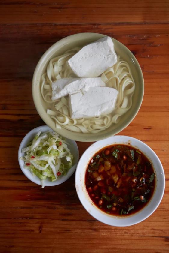 ▲ 配置齐全的豆花面。摄影/朱锐豆花面则是独属于遵义人的“伟大发明”,干拌的尚且不论,有蘸水的就必须得用油辣椒为底子。鲜嫩的豆花和筋道的面条上下一白,浸在豆浆之中,淡香素雅;蘸水则包罗万象,除了各色香料还放入了油炸花生米、油炸豆腐丁等。吃的时候用筷子尖儿挑起豆花,经蘸水碟裹上一层辣椒油,颤巍巍地送入口中,香软细腻又劲道十足。