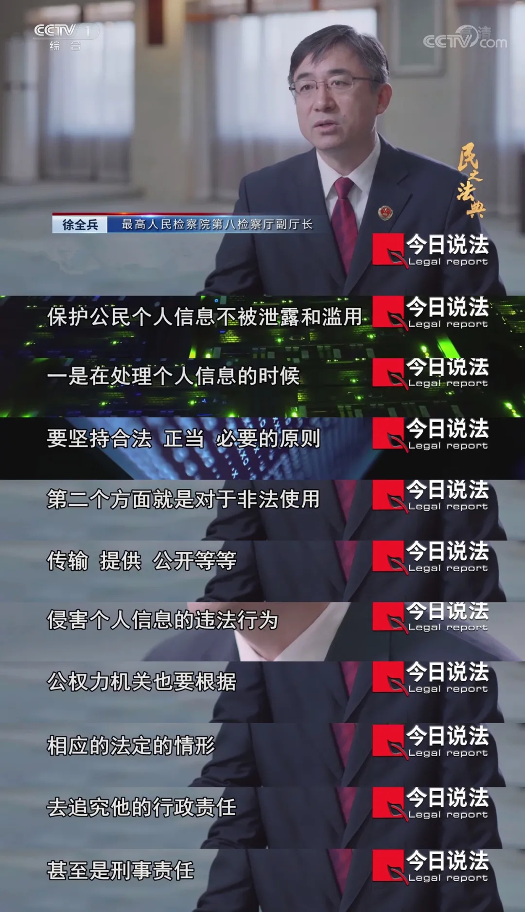 最高人民检察院第八检察厅副厅长徐全兵:保护公民个人信息不被泄露和滥用,一是在处理个人信息的时候要坚持合法、正当、必要的原则;第二个方面就是对于非法使用、传输、提供、公开等等侵害个人信息的违法行为,公权力机关也要根据相应的法定的情形去追究他的行政责任,甚至是刑事责任。