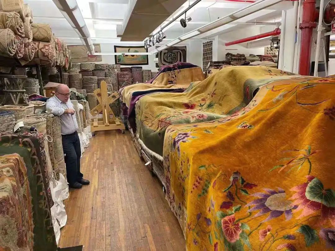 庄见:我大概有2000多条清中晚期的毯子,包括北京毯、民国时期的美术毯,还有宁夏毯。我们这有一个500多平的仓库都满了,都是这些年我们一直收的地毯,数量就越来越大。