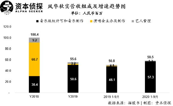 在2018年,风华秋实总营收水平为1亿元人民币,其中演唱会主办及制作相关收入达到6073.7万元,占总收入比例高达60.5%。而这一业务收入在2019年及2020年前三季度则下降为180.6万元和0元,占总营收比例低于5%。