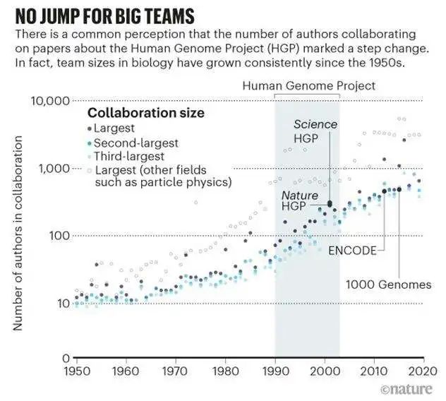 图3. 1950年至2020年基因研究合作项目成员规模变化世界上没有可与人类基因组计划比肩的对照组。因此,不能表明上述趋势是否必然会随着人类基因组计划而出现。从计算能力的提高到复杂的排序方法的发明,种种外部因素也在这些发展中发挥了作用。唯一可以确定的是,人类基因组计划目录推动了基因革命的进行。
