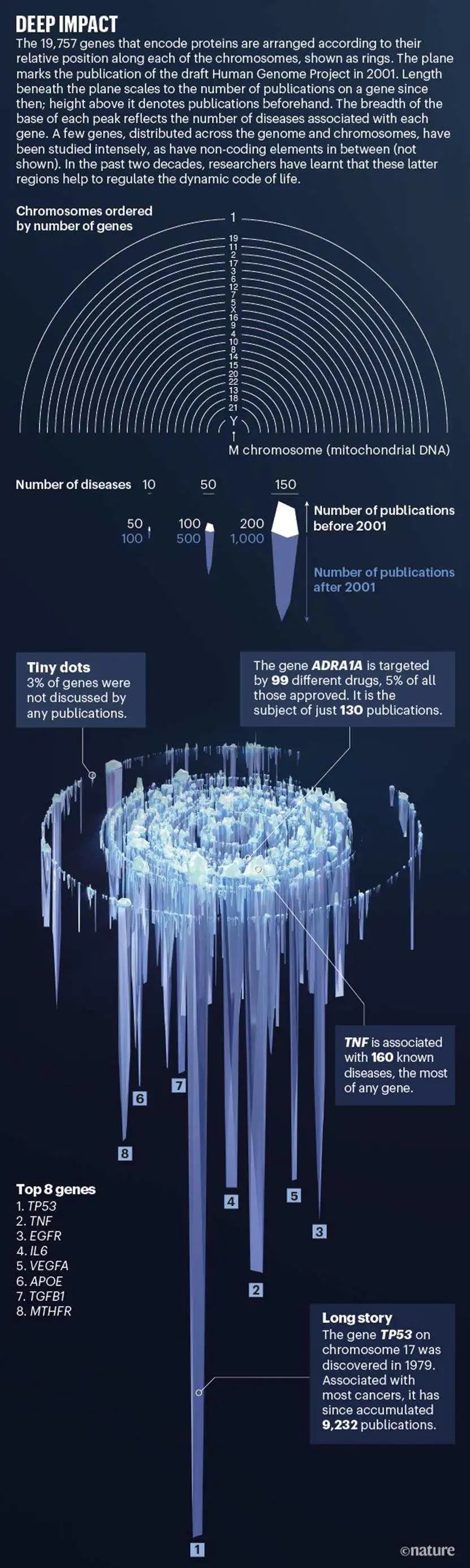 图4. HGP问世前后对基因的研究情况。图中的平面标志着2001年人类基因组计划草图的公布,在其之下的长度表示为草图发表后有关基因的文章数量有关;在其之上表示先前的出版物。每个峰值底部的宽度反映了与每个基因相关的疾病数量。当然,对具有深远生物学意义的基因进行深入研究是必需的。TP53就是一个很好的例子——它对细胞的生长和死亡至关重要,一旦它失活或变异就会导致癌症:从1976年至2017年间,9232篇学术论文提出超过50%的肿瘤序列中都发现了该基因突变。