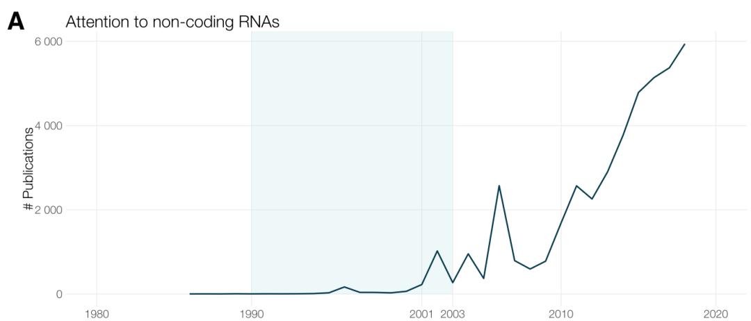 人类基因组计划草图发布后,非蛋白编码元件的发现如雨后春笋般爆发。到目前为止,这种增长数量已经超过了蛋白质编码基因发现量的五倍,且仍没有放缓的迹象。同时,在本项研究所用数据集涵盖的时期(1900至2017年)内,关于这些调控元件的发表物数量也在增长——例如,关于调节基因表达的非编码RNA的论文数以千计。
