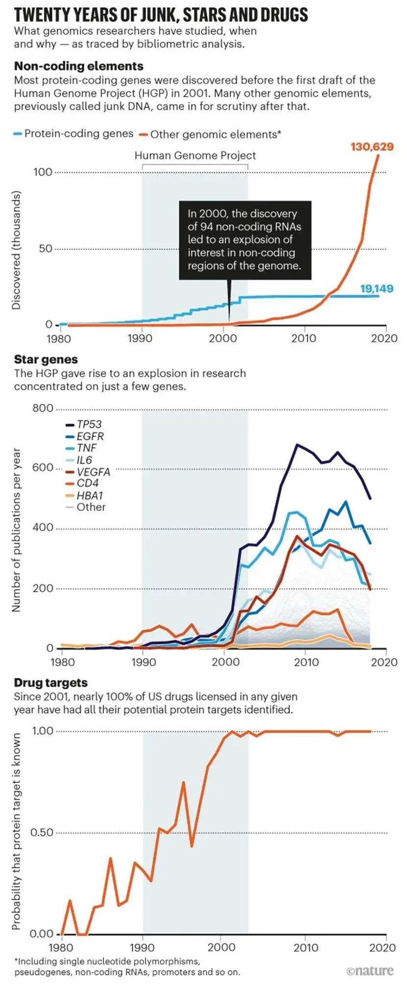 虽然蛋白质编码基因的发现数量进入了平台期,但在人类基因组计划开始之后,人们对单个基因功能的兴趣迅速增长。自2001年以来,每年都有1万至2万篇关于蛋白质编码基因的论文发表。