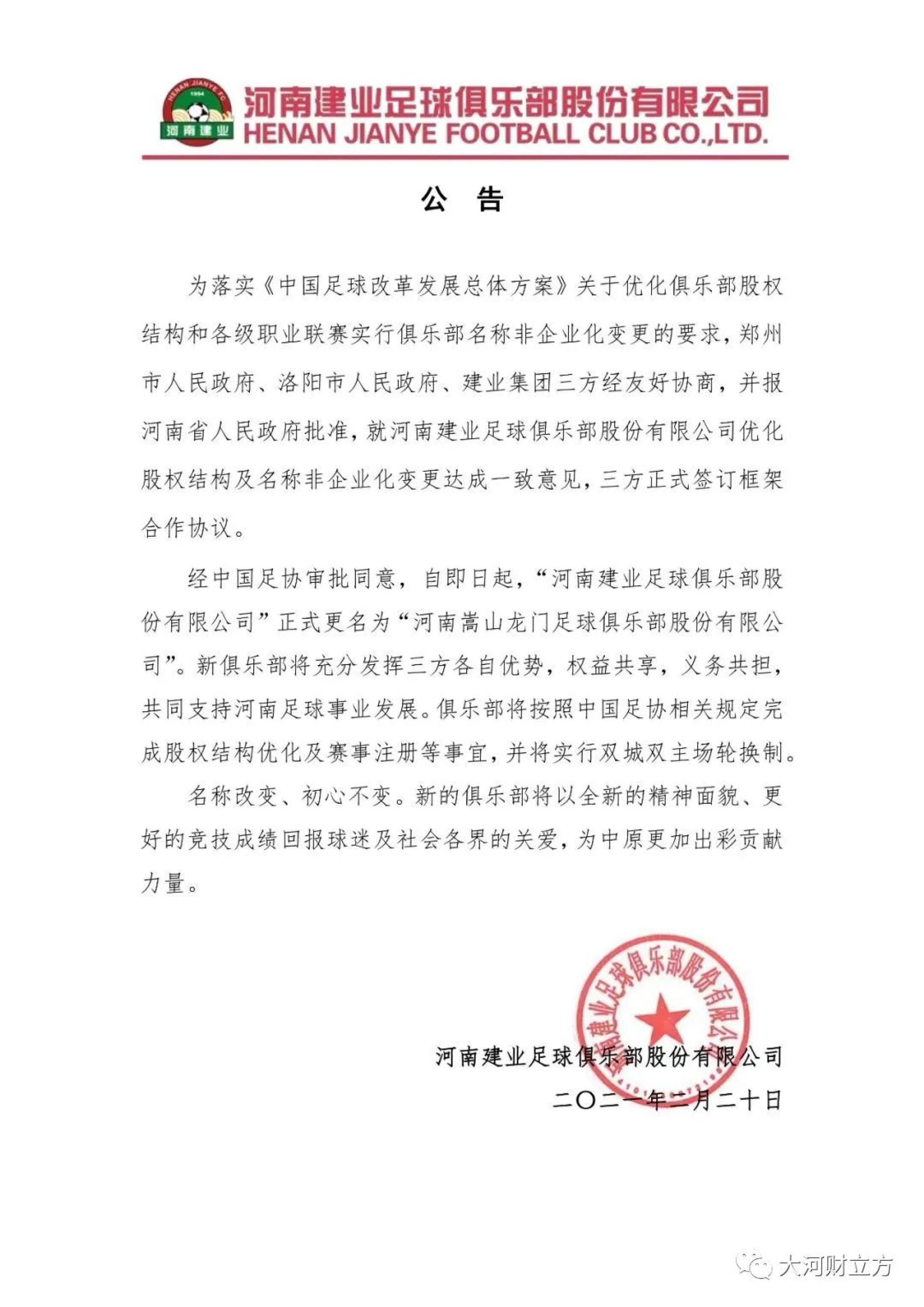 2月20日晚间,大河报·大河财立方记者获悉,“河南建业足球俱乐部股份有限公司”正式更名为“河南嵩山龙门足球俱乐部股份有限公司”。新俱乐部将充分发挥三方各自优势,权益共享,义务共担,共同支持河南足球事业发展。俱乐部将按照中国足协相关规定完成股权结构优化及赛事注册等事宜,将实行双城双主场轮换制。
