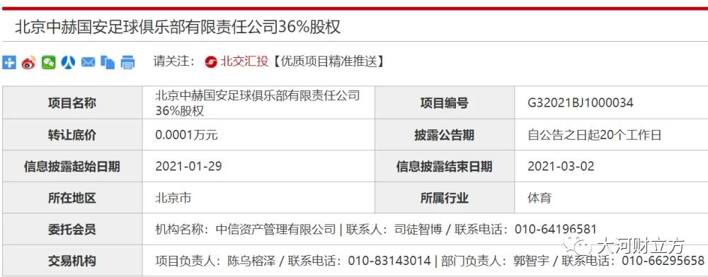 ▲1月29日,中赫集团和中信集团关于国安股权转让事宜有了新进展,据北京产权交易所信息显示,中信集团将所持有的国安足球俱乐部36%股权提交转让,而转让底价是0.0001万元。有业内人士表示,目前大部分中超俱乐部已经完成了球队改名或新名的注册工作,其本意是让球队与国际足联进行接轨,运作更加职业化,真正让俱乐部实现自负盈亏。