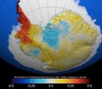 通过长期的数据监测,科学家绘制了这张整个南极的气温变化图。图中可以看出,南极的大部分地区气温都没有明显的变化,上升幅度都小于0.25℃。而红色部分的南极半岛区域,表面温度比1957年上升了3.5℃。这个数据变化非常明显。