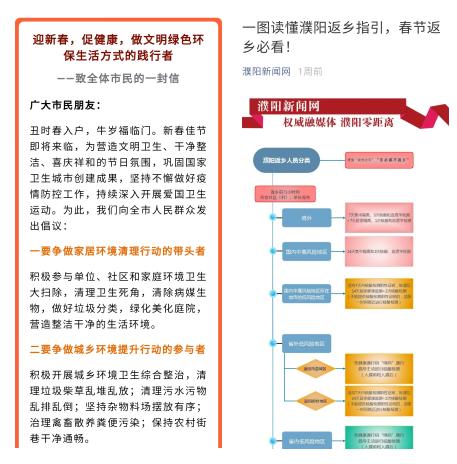 五是做好节日期间疫情防控宣传,全市各级各类媒体每日刊发“风险提示”“防控常识”“防护知识”等疫情防控通知、通告、提醒、科普报道,全媒体发布《致广大市民的一封信》《濮阳出台春节返乡人员最新规定》《温馨提醒:请慎重购买进口食品》《一图读懂濮阳返乡指引,春节返乡必看》《在公共场所要“科学佩戴口罩”》《春节防疫表情包来了!》《文明祥和平安过春节倡议书》《农村有效防控疫情,专家支招》《春节防疫表情包上新!》等信息。重点开展对外宣传,濮阳形象更出彩
