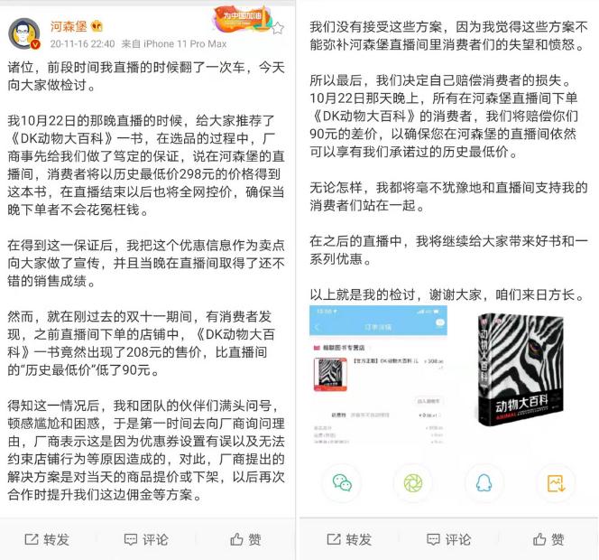 2020年10月,他在直播间里推荐《DK动物大百科》,厂商承诺提供298元的“历史最低价”,并且保证在直播结束后全网控价。然而,同一本书在“双十一”期间却出现了208元的低价,与此前的承诺背道而驰。