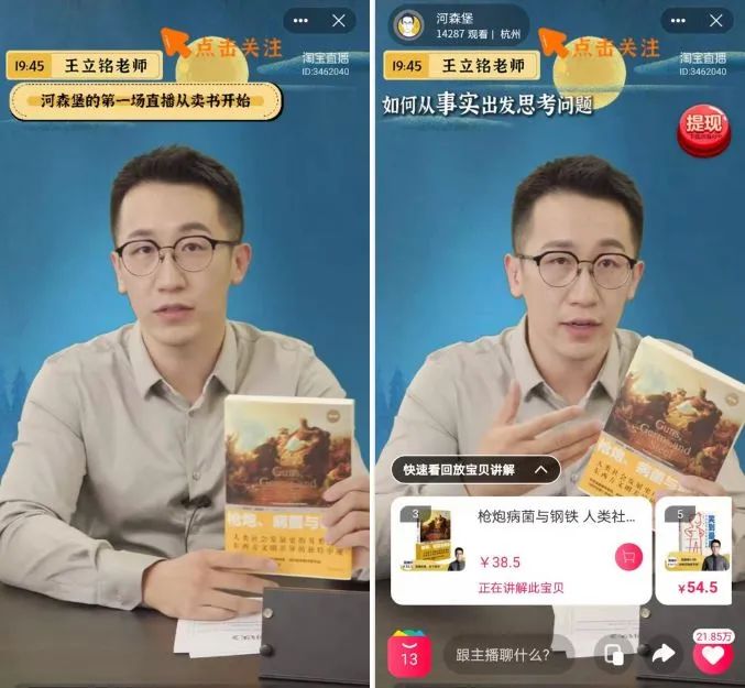 卖书,是河森堡直播间的特色,他习惯用文化内容开场和结尾。当他在镜头前拿起书时,好像又回到了博物馆,故事和知识从他口中交替而出,有时还会带上几分严肃。王立铭、马伯庸、六层楼等创作者,也都曾出现在他的直播间里,以书会友。