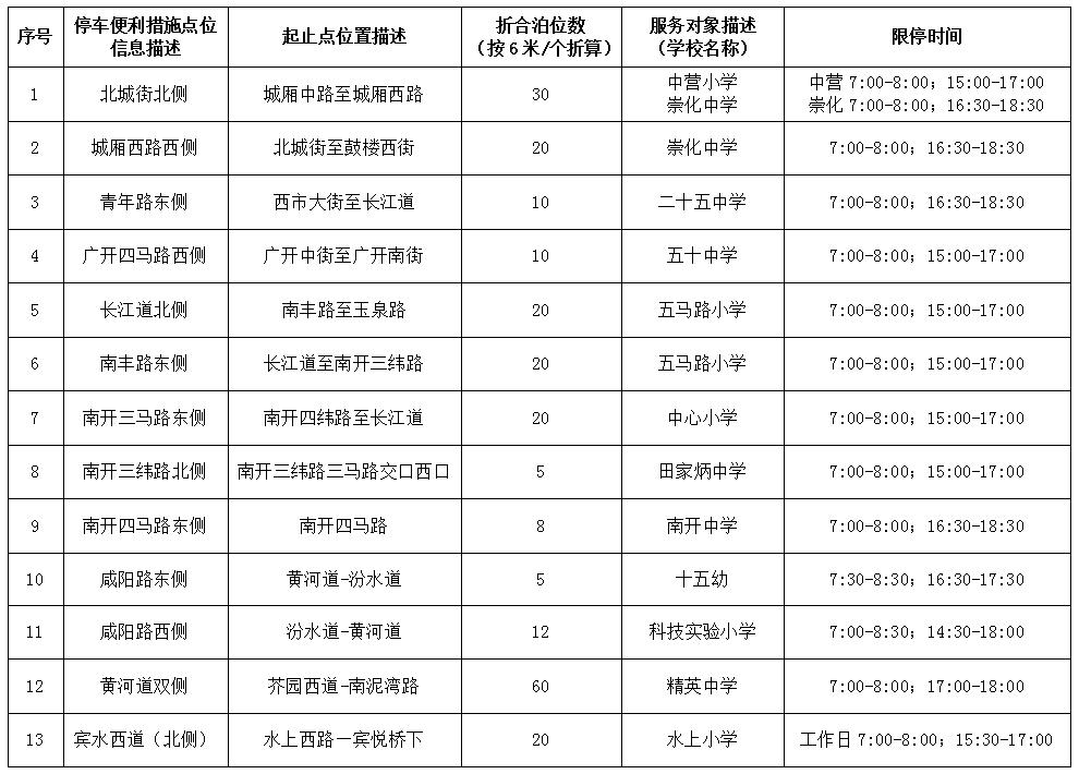 天津公安交管部门还发布南开区部分中、小学以及幼儿园门前限时停车路段及允许停车时间,提示家长在限时停车路段内按照交通标志、标线指示有序停车。